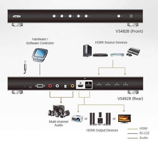Ponadto VS482B oferuje wiele sposobów przełączania między źródłami HDMI: za pomocą przycisków na panelu przednim, pilota na podczerwień i poleceń RS-232, umożliwiając użytkownikom bezproblemowy wybór żądanego wejścia. Wyposażony w EDID Expert, VS482B oferuje użytkownikom optymalne ustawienia EDID, zapewniające sprawniejsze włączanie i najwyższej jakości wyświetlanie na różnych ekranach. Wyposażenie w powyższe funkcje zapewnia praktyczne rozwiązanie dla audytorium, kina domowego, sal konferencyjnych, targów, centrów handlowych i innych.