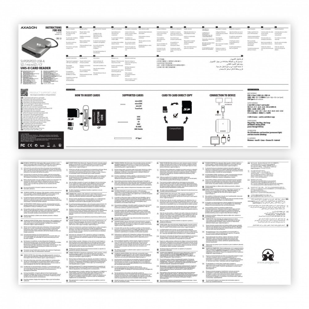 Aluminiowy czytnik kart pamięciowych 3w1 AXAGON CRE-S3 SUPERSPEED z interfejsem USB 3.2 Gen 1 obsługuje wszystkie aktualne wersje kart SD i microSD, w tym SDXC i microSDXC o pojemności do 2TB. Obsługuje również karty CF o pojemności do 128PT.
