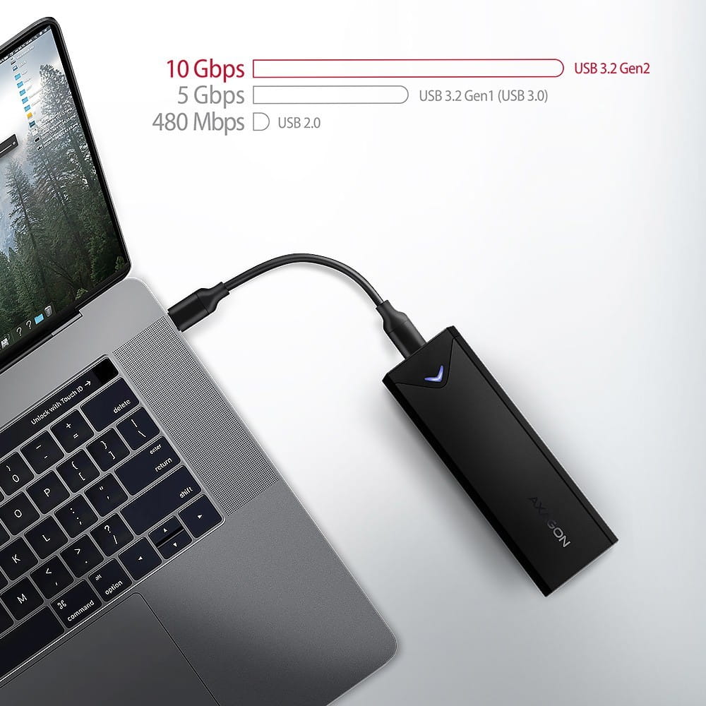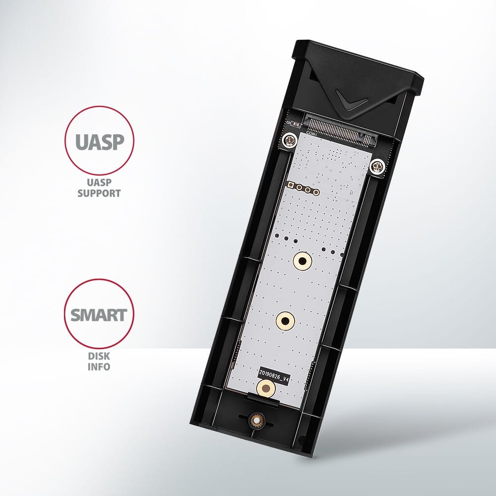 Dzięki szybkiemu interfejsowi USB 3.2 Gen 2 prędkość transmisji wynosi do 10Gb/s. Zewnętrzna obudowa M.2 obsługuje także inne nowoczesne funkcje, np. UASP, TRIM i umożliwia odczyt informacji S.M.A.R.T. monitorujących stan dysku. Obsługa trybu standby w stanie bezczynności.