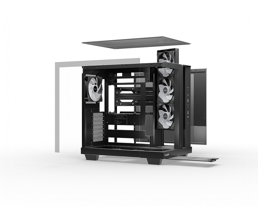 Light Base 500 LX Black posiada 4 preinstalowane wentylatory Light Wings LX. Tylny wentylator to Light Wings LX 120mm PWM, wentylatory z boku to Light Wings LX 120mm PWM z odwróconymi łopatkami. Wszystkie wentylatory są wyposażone w 16 diod LED wewnątrz piasty wirnika, co zapewnia niepowtarzalne podświetlenie ARGB. Odwrócone łopatki wentylatora zapewniają, że ich ładna strona jest widoczna przez cały czas.