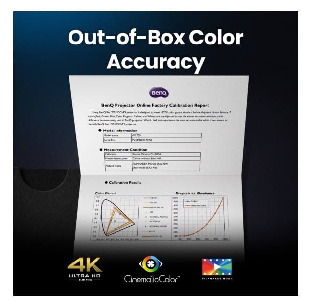 Doświadcz filmowej wierności obrazu dzięki projektorowi kina domowego BenQ W2720i, wykorzystującego technologię BenQ CinematicColor. Precyzyjnie obejmuje 90% przestrzeni kolorów DCI-P3 i 98% Rec.709, zapewniając dokładne odwzorowanie kolorów zgodne z wizją reżysera.