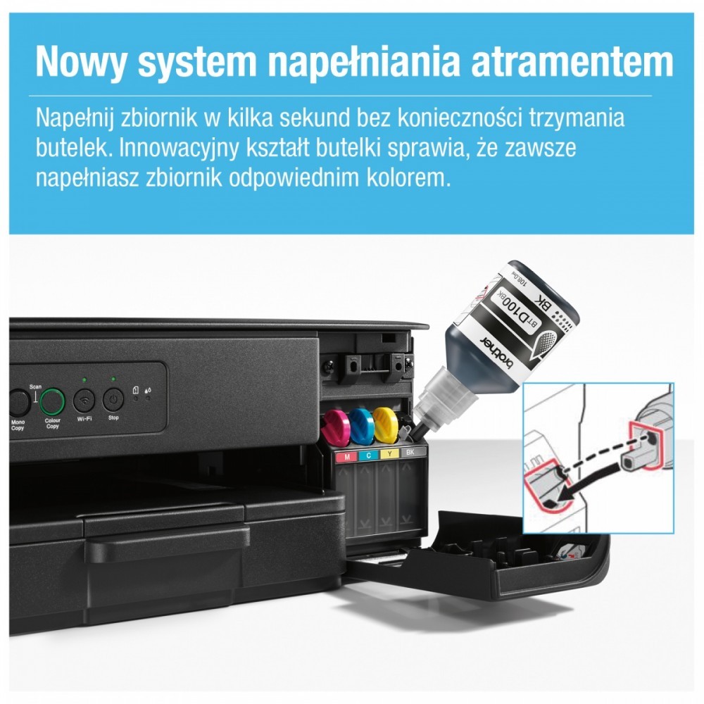 Drukuj więcej płacąc mniej, dzięki super wysokowydajnym butelkom z tuszem, które z łatwością możesz wlać do tego modelu. Ciesz się bezproblemową łącznością i drukowaniem bez zacięć korzystając z urządzenia wielofunkcyjnego DCP-T430W niezależnie od miejsca, w którym jest użytkowane. Drukuj bezpośrednio z lub skanuj do komputera stacjonarnego, aplikacji mobilnej.