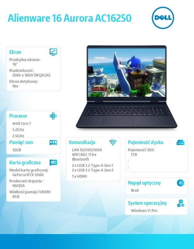 Opis dotyczy serii notebooków Alienware 16 Aurora AC16250. Rzeczywiste cechy mogą się różnić w zależności od konfiguracji notebooka.
