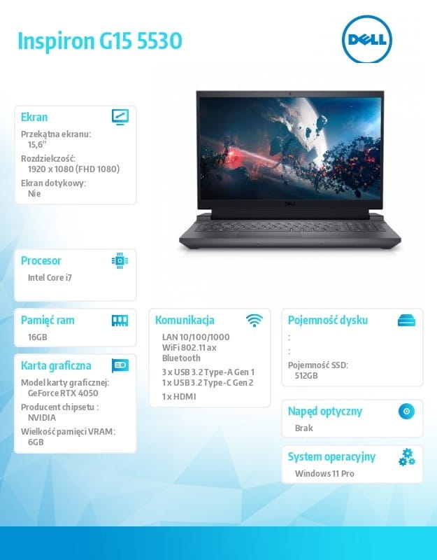 Opis dotyczy serii notebooków Inspiron G15 5530. Rzeczywiste cechy mogą się różnić w zależności od konfiguracji notebooka.