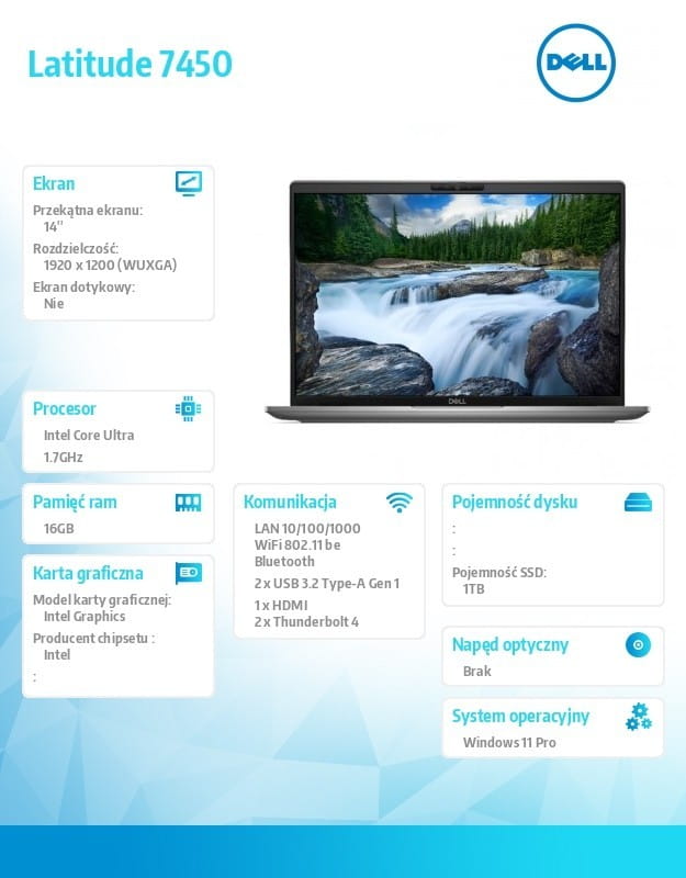 - Smukła konstrukcja: Model Latitude 7450 Ultralight ma wytrzymałą obudowę ze stopu magnezu w zachwycającym kolorze River Blue.