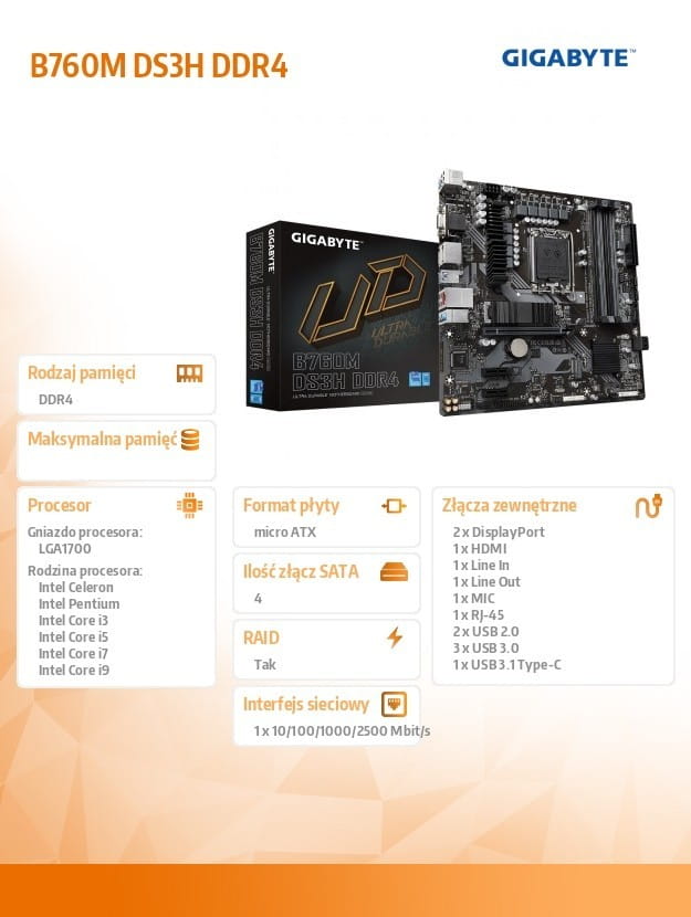 Gigabyte Płyta główna B760M DS3H DDR4 s1700 DDR4 2DP/HDMI mATX