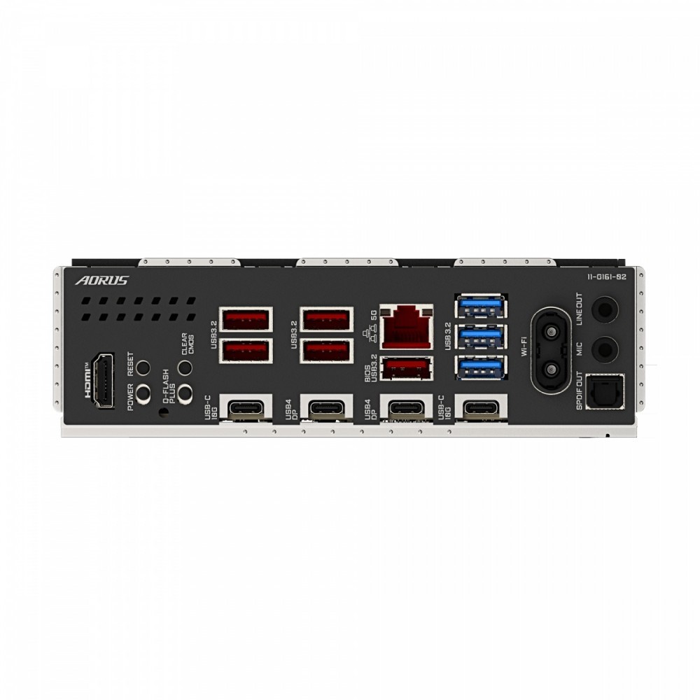 Złącza zewnętrzne: 1 x Przycisk Clear CMOS, 1 x Przycisk Q-Flash Plus, 2 x Wi-Fi Module, 2 x USB4 Typ-C, 2 x USB 3.2 Gen 2 Type-C, 3 x USB 3.2 Gen 1 Type-A, 5 x USB 3.2 Gen 2 Type-A, 1 x RJ-45, 1 x S/PDIF, 1 x HDMI, 1 x Line Out, 1 x MIC, Przycisk Power, Przycisk Reset