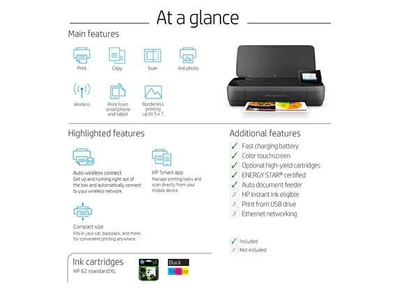 Szybkie drukowanie, kopiowanie i skanowanie wielostronicowych dokumentów bez użycia rąk dzięki automatycznemu podajnikowi dokumentów na 10 arkuszy. Po prostu podłącz i drukuj z laptopa lub urządzeń mobilnych. Rozpocznij drukowanie od razu po rozpakowaniu dzięki szybkiej i łatwej konfiguracji, korzystając z funkcji HP Auto Wireless Connect. To trwałe, kompaktowe urządzenie wielofunkcyjne mieści się w plecaku, samochodzie i nie tylko, zapewniając wygodne drukowanie w dowolnym miejscu.