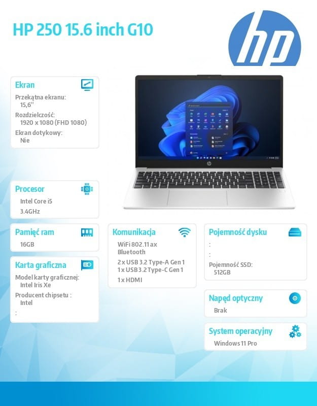 Laptop HP 250 G10 zapewnia podstawowe funkcje biznesowe w smukłej i lekkiej konstrukcji, którą można wszędzie ze sobą zabrać. 15,6-calowy ekran o 85-procentowym współczynniku proporcji do obudowy, wszechstronny procesor Intel, szybka pamięć RAM i optymalna pamięć masowa dostarczają potrzebnej wydajności, a pomocne porty pozwalają podłączyć różne urządzenia peryferyjne - wszystko to w bardzo przystępnej cenie.