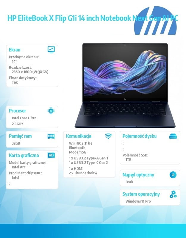 Rozwijaj swoją firmę dzięki sztucznej inteligencji, która wykorzystuje Twoje własne dane do podejmowania strategicznych decyzji. Odkryj, co możesz zrobić dzięki aplikacjom AI, zaawansowanym funkcjom współpracy, czterem wszechstronnym trybom pracy i zoptymalizowanemu czasowi pracy baterii w komputerze HP EliteBook X Flip G1i Next Gen AI.