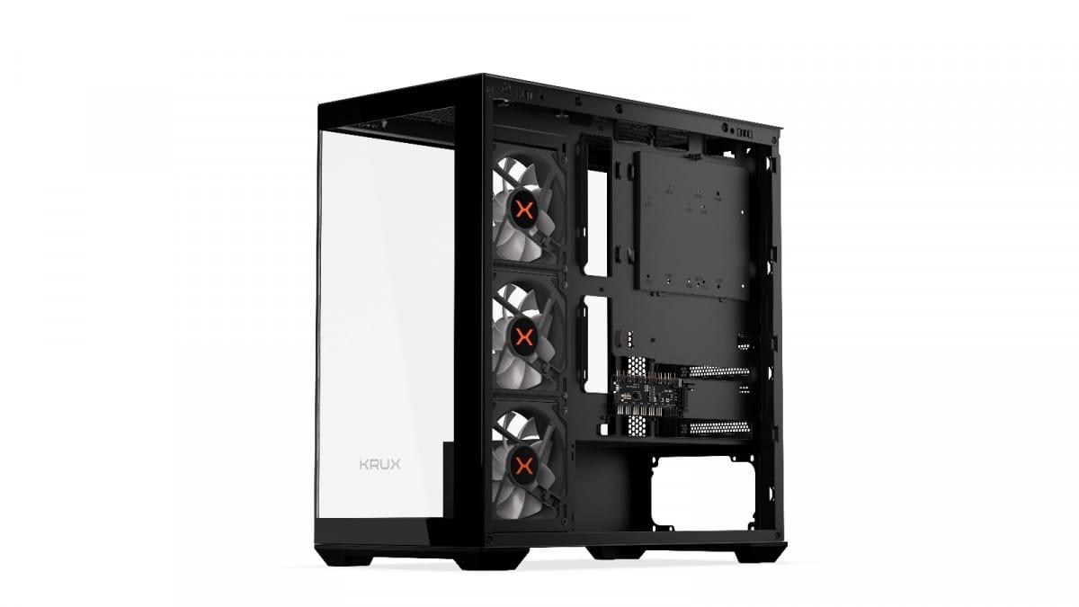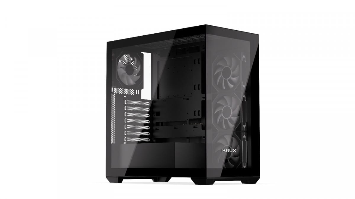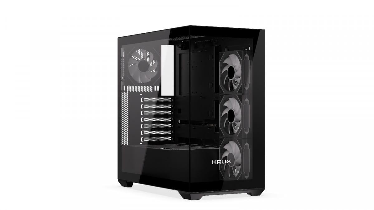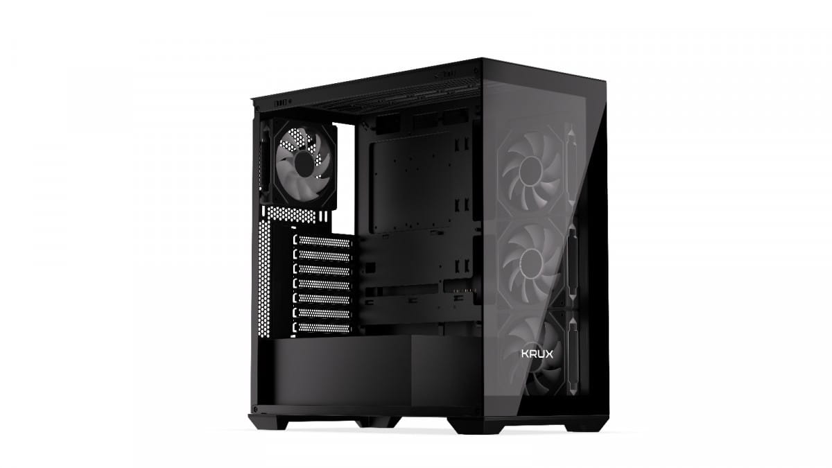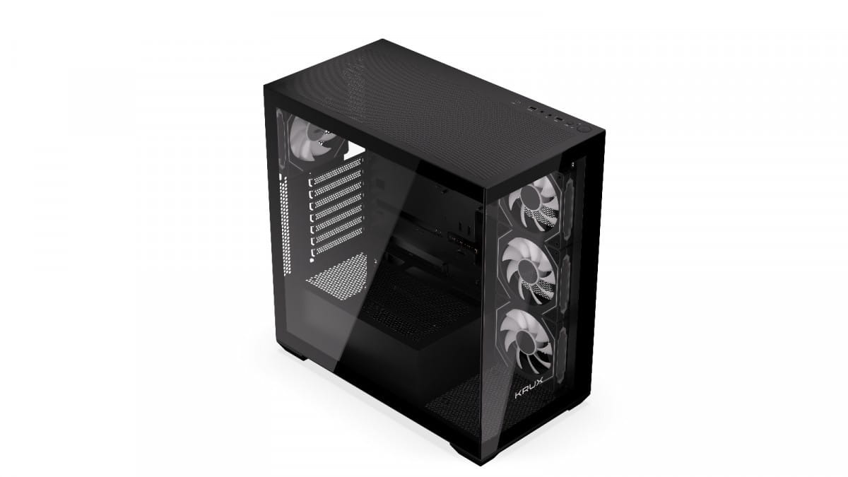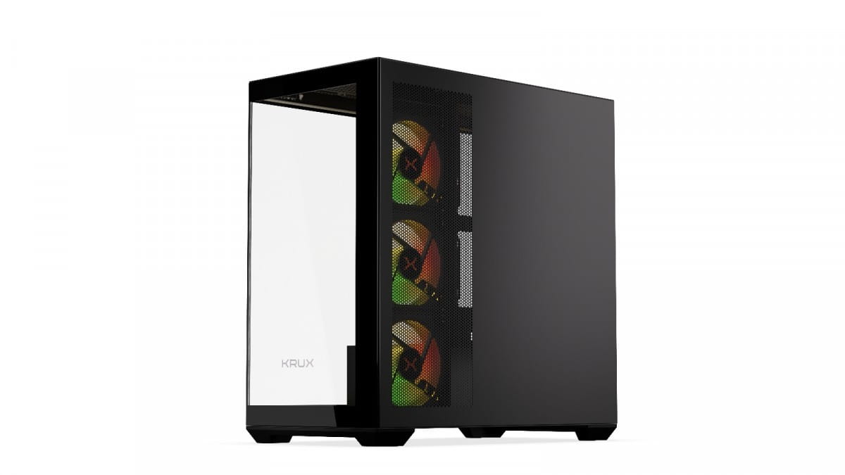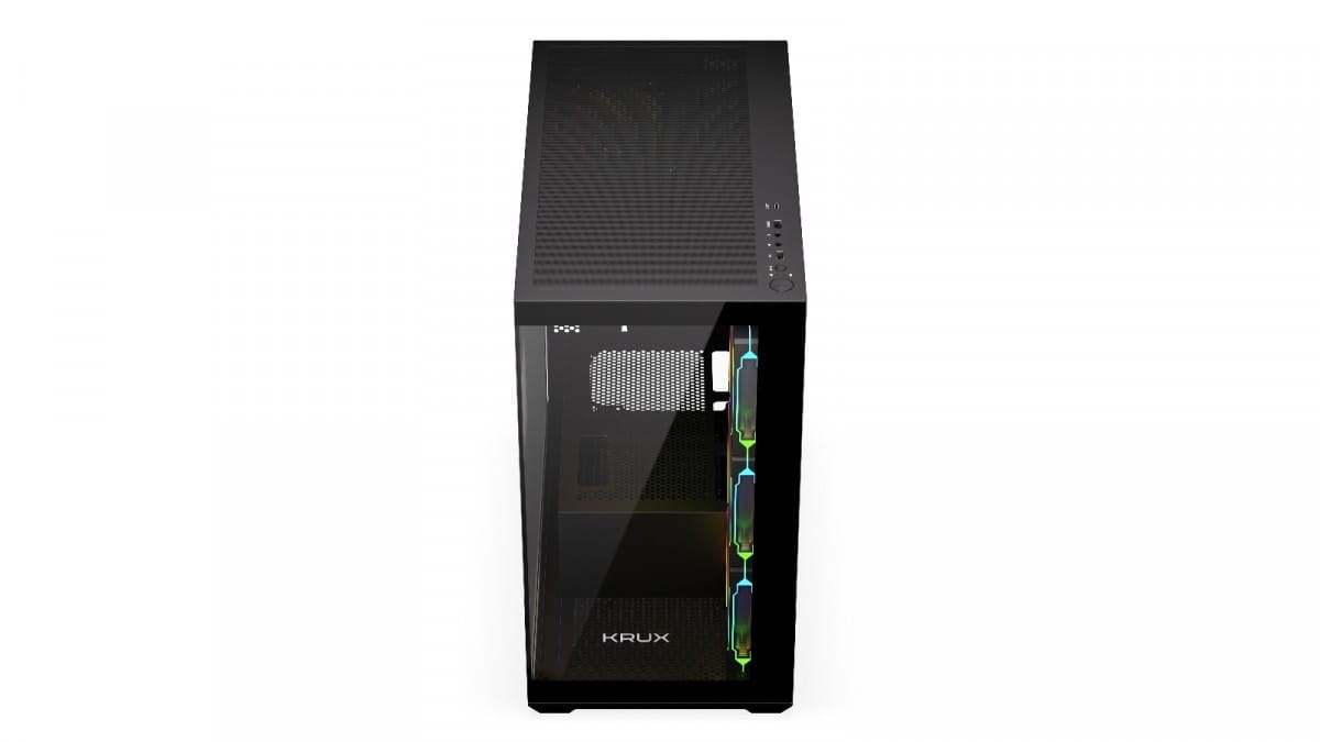 Krux Exo jest fabrycznie wyposażony w zestaw komponentów, które dadzą Ci tonę frajdy z personalizacji. Po pierwsze, znajdziesz w nim cztery preinstalowane wentylatory 120 mm z ARGB. Po drugie, całość od razu wyposażona jest w splitter do sterowania podświetleniem poszczególnych elementów osobno. A na zamknięcie tego dobrego zestawu przycisk pozwalający zmienić preset podświetlenia bez potrzeby ingerencji przez aplikację. Czego więcej trzeba, żeby było ładnie?