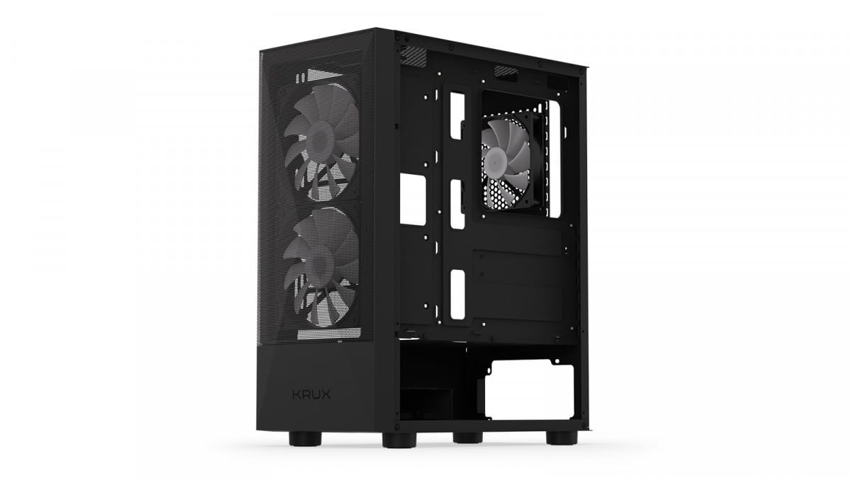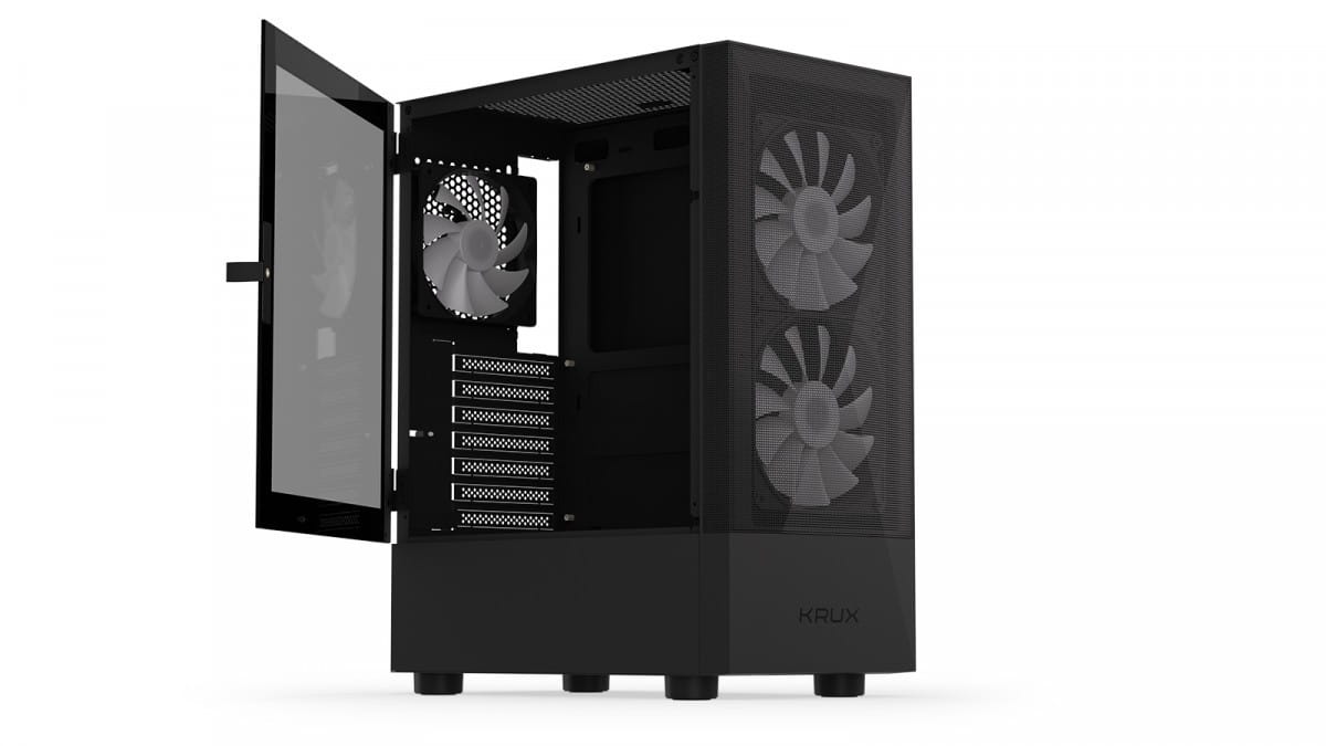 Trzy montowane fabrycznie w obudowie Krux wydajne wentylatory RGB zapewniają ponadprzeciętny przepływ powietrza, wpływający bardzo pozytywnie na temperaturę podzespołów oraz ich głośność działania. Dwa 140 mm śmigła tłoczą świeże powietrze, natomiast jedno 120 mm wyciąga ciepłe i niepożądane tyłem.