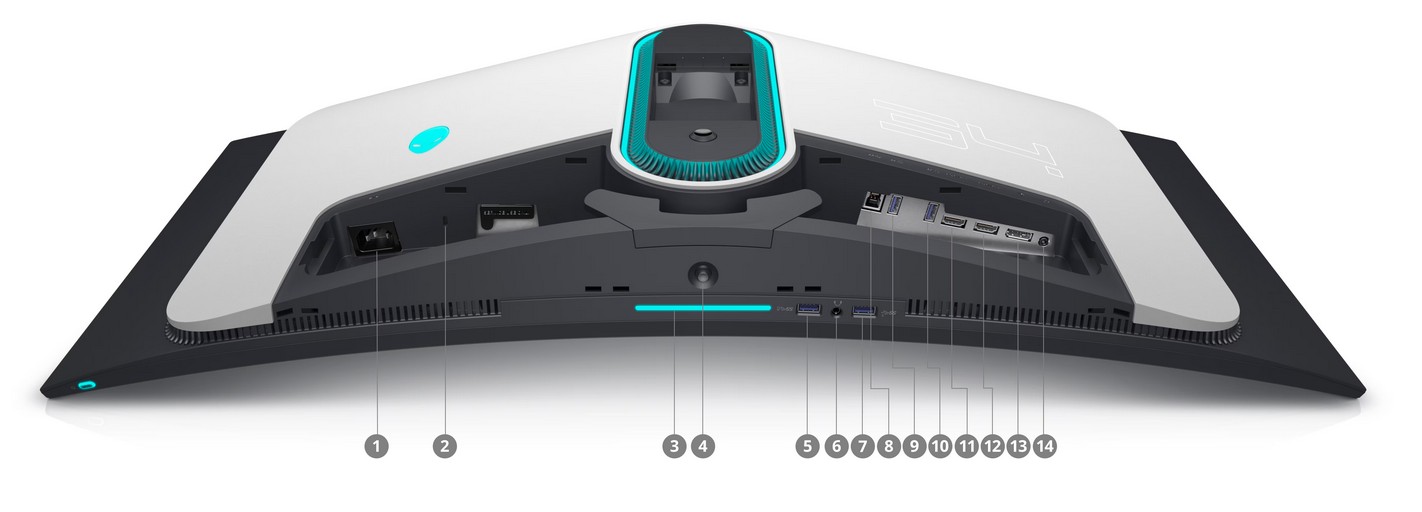 1. Złącze zasilania | 2. Gniazdo blokady zabezpieczającej | 3. Downlight | 4. Joystick OSD | 5. Port SuperSpeed USB 5 Gbps (USB 3.2 Gen1) typu A downstream z funkcją ładowania | 6. Gniazdo słuchawkowe | 7. Port SuperSpeed USB 5 Gbps (USB 3.2 Gen1) typu A downstream | 8. Port SuperSpeed USB 5 Gbps (USB 3.2 Gen1) typu B upstream | 9. Port SuperSpeed USB 5 Gbps (USB 3.2 Gen1) typu A downstream | 10. Port SuperSpeed USB 5 Gbps (USB 3.2 Gen1) typu A downstream | 11. Port HDMI (HDMI 1) | 12. Port HDMI (HDMI 2) | 13. DisplayPort | 14. Port wyjścia liniowego