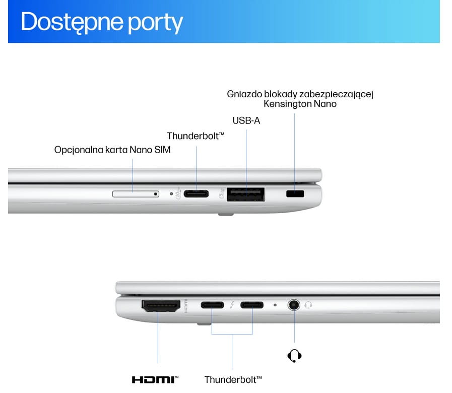 - Porty: 2 gniazda Thunderbolt™ 4 ze złączem USB-C® o przepustowości 40 Gb/s (zasilanie z USB, DisplayPort™ 2.1, HP Sleep and Charge); 1 port USB-C® o przepustowości 10 Gb/s (zasilanie przez USB, DisplayPort™ 1.4); 1 port HDMI 2.1; 1 gniazdo combo jack (słuchawki/mikrofon) stereo; 1 port USB-A o przepustowości 5 Gb/s (zasilany)