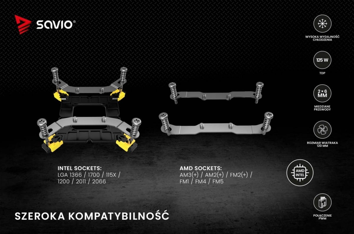 SAVIO FROST X2 jest kompatybilny z większością procesorów Intel i AMD. W zestawie znajdują się akcesoria montażowe, które zapewniają zgodność z popularnymi podstawkami procesorów, takimi jak LGA 1200, 1151, 1150, 1155, 1156, 1366, 1700, 2011, 2066 oraz AM3(+), AM2(+), FM2(+), FM1, AM4, AM5. Montaż chłodzenia jest prosty i szybki, dzięki dołączonemu zestawowi montażowemu i instrukcji obsługi.