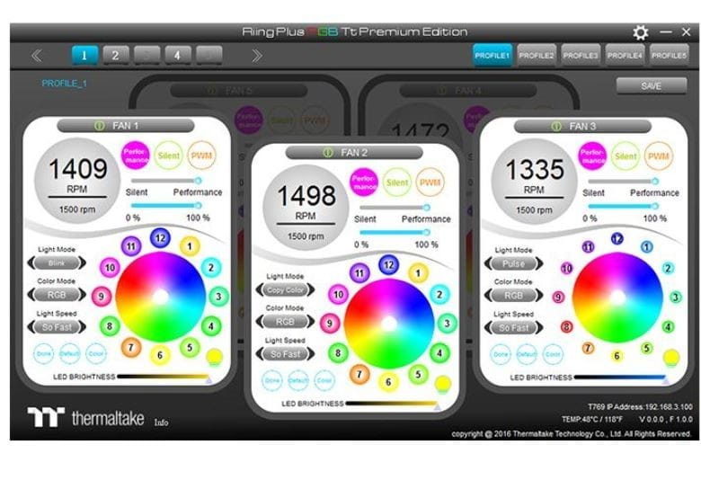 Thermaltake łączy opatentowane, wspaniałe podświetlenie LED z najnowocześniejszą technologią, aby zapewnić zupełnie nowe wrażenia podczas korzystania z chłodzenia komputera. W zestawie znajdują się trzy wentylatoy o wysokim ciśnieniu statycznym i średnicy 120 mm z opatentowanym pierścieniem LED o illuminacji 16,8 mln kolorów (12 kontrolowanych pojedynczych diod LED). Wentylator Riing Plus 14 RGB posiada łopatki kompresyjne, łożysko hydrauliczne i cyfrowy kontroler wentylatora, dzięki czemu może być kontrolowany przez opatentowane oprogramowanie TT RGB PLUS, jak również przez interaktywne sterowanie głosowe AI.