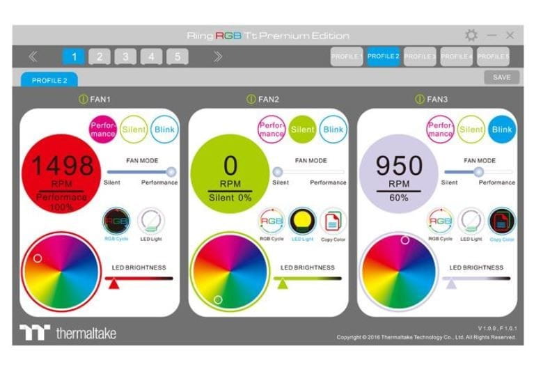 Numer każdego koncentratora wentylatorów jest wyświetlany w lewym górnym rogu interfejsu użytkownika. W prawym górnym rogu użytkownicy znajdą profile. Użytkownicy mogą skonfigurować maksymalnie pięć profili. Za pomocą panelu sterowania można dostosować tryb prędkości wentylatorów i tryb oświetlenia LED dla odpowiedniego wentylatora. Po zakończeniu ustawień użytkownicy muszą kliknąć SAVE, aby ustawienia zostały zapisane.